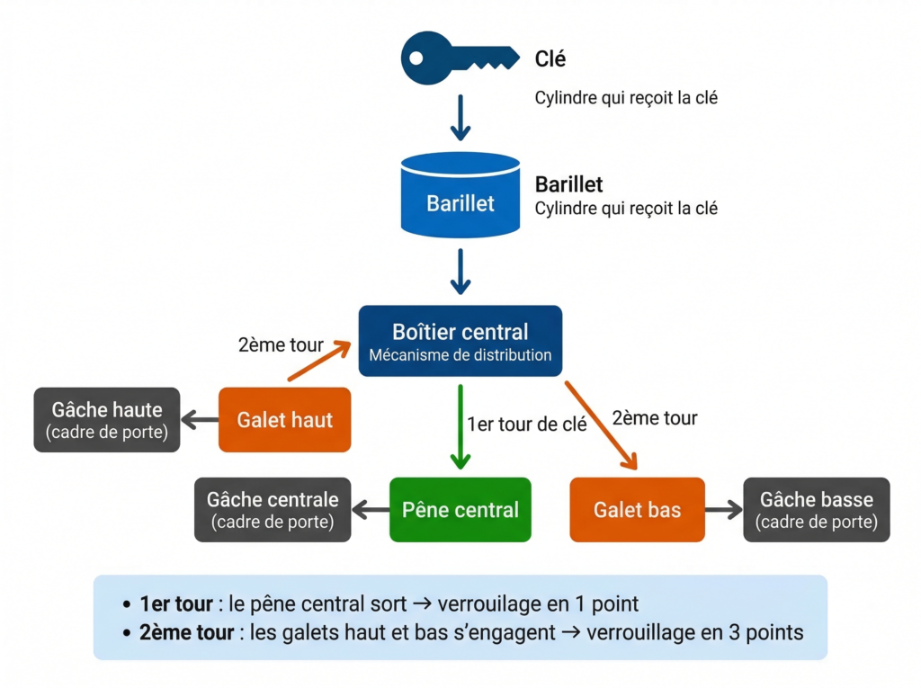 Les tiges et galets : deux tiges métalliques partent du boîtier central, une vers le haut et une vers le bas. En bout de course, elles actionnent des galets (des cylindres métalliques) qui s’engagent dans les gâches du cadre de porte.